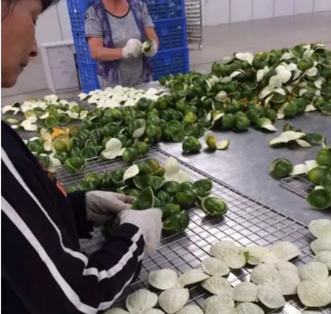 2、剝好的陳皮由車間工人集中運(yùn)至裝料區(qū),由裝料工人開始裝入物料托盤,上物料架,馬上要準(zhǔn)備大批量烘干咯。