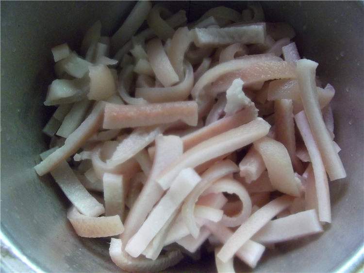 經(jīng)過烘干后的豬皮會溢出許多油脂,因此在后期的加工中需要清除油脂,才能進行油爆漲發(fā),如果不清除附著在豬皮上的油污,則無法制作出皮肚,清除的方法為將豬皮浸泡在溫堿水中,用毛刷刷干凈油污,再用溫清水漂洗干凈瀝干水分即可。