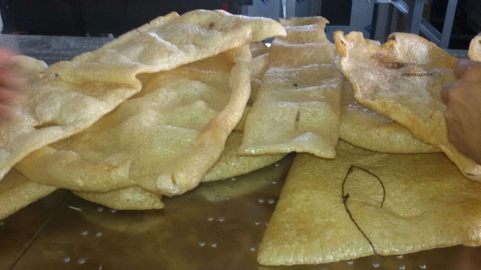 可選用煺毛后的、無疫病、無疤痕的豬皮。先將剝下的豬皮放入溫水中浸泡30分鐘,然后用竹刷或塑料刷刷洗,用刀刮除表皮上的污物,修凈污物,去凈雜毛并采取連根拔除的方法,盡量不用利刀刮毛的便利方法,避免將毛根留在肉皮內而影響成品品質,將殘留的肉皮表面的脂肪用刀修理干凈,要求不得殘留一絲脂肪,以免影響油爆漲發(fā)的程度,然后將清洗干凈、已去除脂肪的豬皮進行分切整形(有些地區(qū)的傳統(tǒng)工藝需要蒸煮后在分切),分切快形大小在5-10平方厘米之間,不得超過10平方厘米,否則油爆漲發(fā)后包裝困難,小于5平方厘米的自然皮塊也可以加工,無需再切成小塊和整形,否則經(jīng)包裝、運輸、銷售環(huán)節(jié)后容易造成碎塊,根據(jù)市場需求也可以將豬皮切絲、切丁等形狀,以滿足不同的客戶需求,將切好的皮塊放入物料網(wǎng)格盤,將物料網(wǎng)格盤像抽屜一樣插入物料車,將物料車推入烘干房,關閉封閉門,烘干就可以開始了。