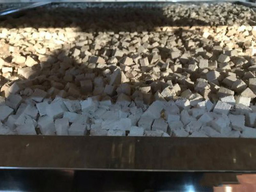 茯苓片采用的復烘方式,溫度點控制在41度-45度之間,烘干8小時后停機,主機靜止2小時,使茯苓片中心水分自然外移后進行復烘7小時完成整個批次,苓丁比容易開裂,所以烘干的溫度控制在35度以下,除濕量按照階梯濕量進行循序下降的方式,中間需要插入幾段冷風的形式,讓茯苓丁進行冷卻收縮,然后采取烘干和冷卻交替的方式完成,這樣茯苓丁的開裂比例將會縮小到一定范圍。