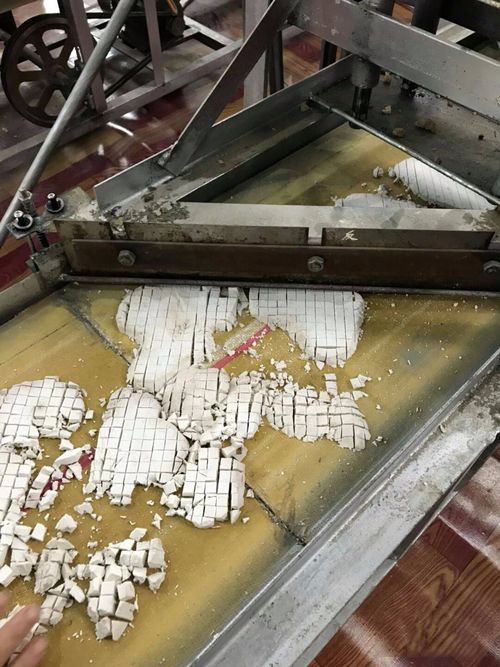 去完皮的茯苓根據(jù)生產(chǎn)需要進行切片或者切?。ㄜ蜍叨∫话闱谐?.8mm*0.8mm的正方形小粒)的工序,一般選擇半自動或者全自動設備完成。