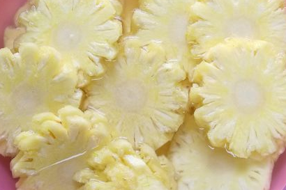 取八成熟菠蘿,果肉已轉(zhuǎn)黃色,具菠蘿芳香,去除爛果、病果、蟲(chóng)果,用人工或機(jī)械辦法去皮去心去果眼,果肉已轉(zhuǎn)黃色,具菠蘿芳香,切片,每片大小厚度3―4毫米,呈扇狀。