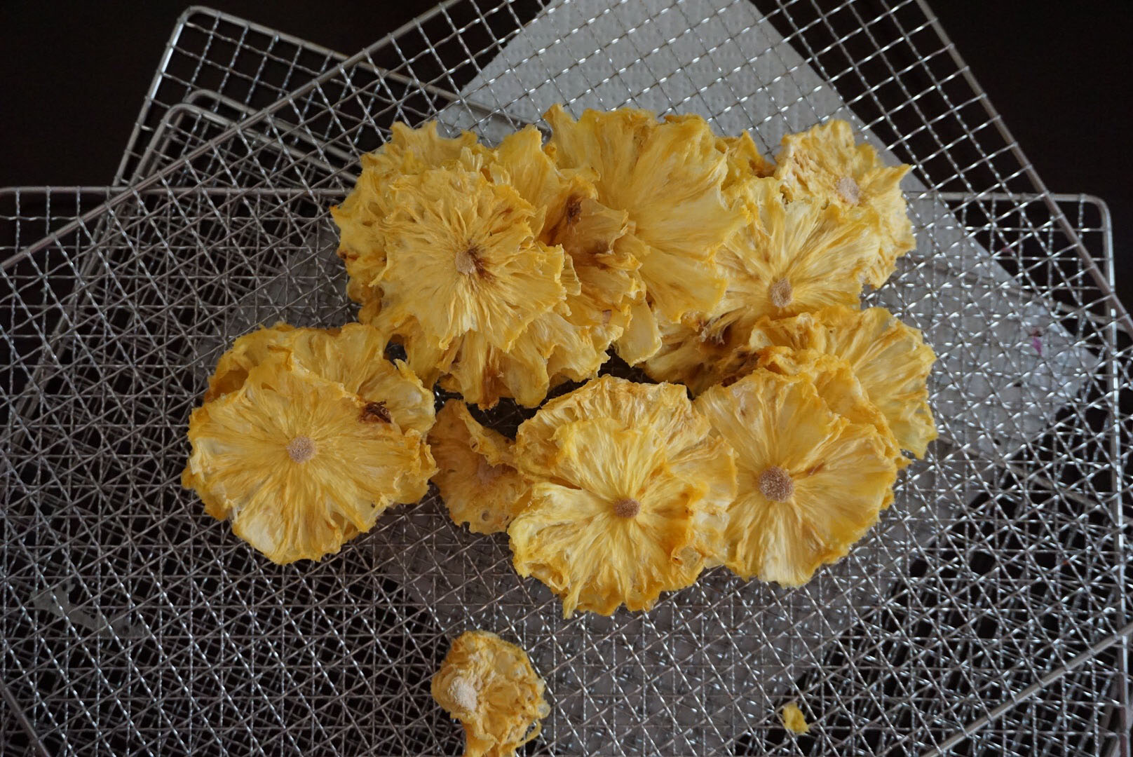 脫水菠蘿的加工技術(shù)相似于芒果干,因?yàn)椴ぬ}果肉組織比較疏松,含水量較多,如果直接干制而得菠蘿干,其缺點(diǎn)是:成品得率很低,而且風(fēng)味欠佳,使用一般干燥方式對(duì)風(fēng)味影響太大。為了提高得率,改進(jìn)制品風(fēng)味,在加工過(guò)程中加入部分蔗糖。