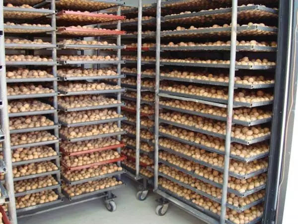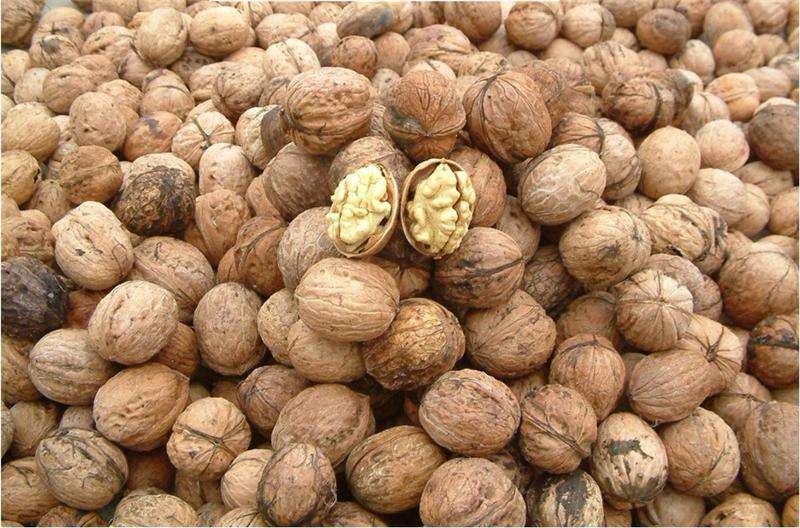 核桃漂白后可陰涼半天,待大部分水分蒸發(fā)后再攤曬。也可采取40~50℃溫度烘干。曬干的標(biāo)志是種仁的皮色由乳白色變?yōu)榈S褐色,橫隔膜容易折斷。干核桃應(yīng)放在通風(fēng)、干燥的室內(nèi)貯存。