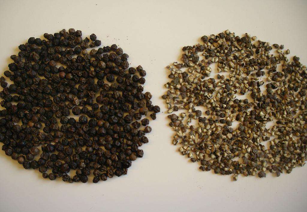 黑胡椒和白胡椒并不是胡椒種類的不同,而僅僅只是胡椒采收和生產(chǎn)工藝的不同而已。黑胡椒以胡椒果實(shí)長(zhǎng)大且較均勻時(shí),采摘未完全成熟的綠胡椒,以此作為烘干黑胡椒的原料;白胡椒以胡椒穗中有部分果實(shí)色澤由青轉(zhuǎn)黃、轉(zhuǎn)紅時(shí),采摘整串胡椒穗,此作為烘干白胡椒的原料。