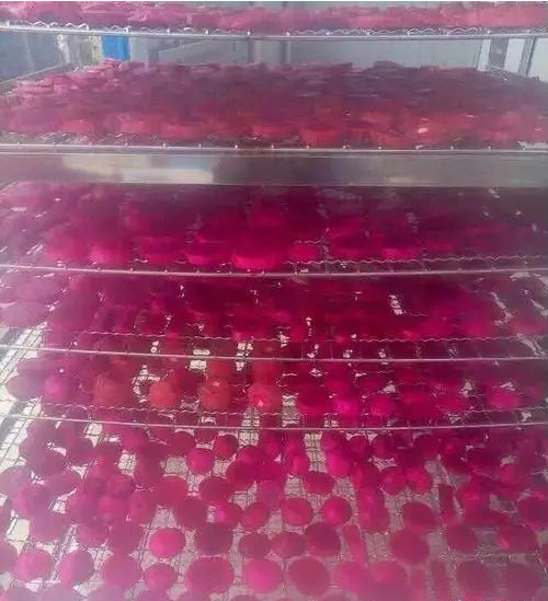 6、火龍果烘干機(jī)工藝參數(shù)的設(shè)定。設(shè)置好火龍果烘干機(jī)的溫度和濕度參數(shù)??究緶囟仍礁?,果脯的色澤與口咸越差。其中以55-75攝氏度的溫度烘烤16-20小時(shí)的效果較好。在烘烤時(shí),烘干房?jī)?nèi)的兩個(gè)通道注意物料平衡,使火龍果片受熱均勻。大的火龍果12公斤可制成1公斤火龍果干,小的火龍果14公斤制成1公斤火龍果干。