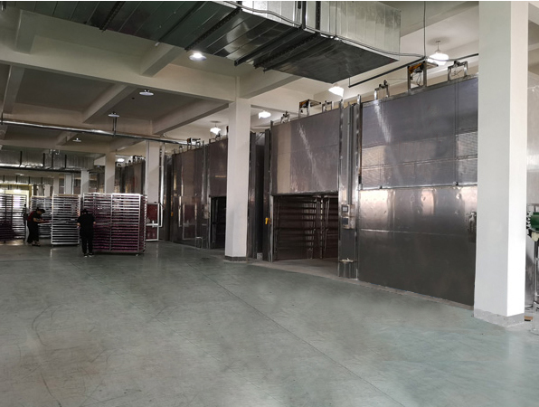5、推進(jìn)火龍果烘干機(jī)內(nèi)進(jìn)行烘烤。使用火龍果烘干機(jī)(空氣能烘干設(shè)備)進(jìn)行烘烤。將浸糖后的火龍果片裝盤(pán),放上物料車(chē),推進(jìn)烘干房?jī)?nèi),烘至果片表面糖漿不再粘滯為合適。